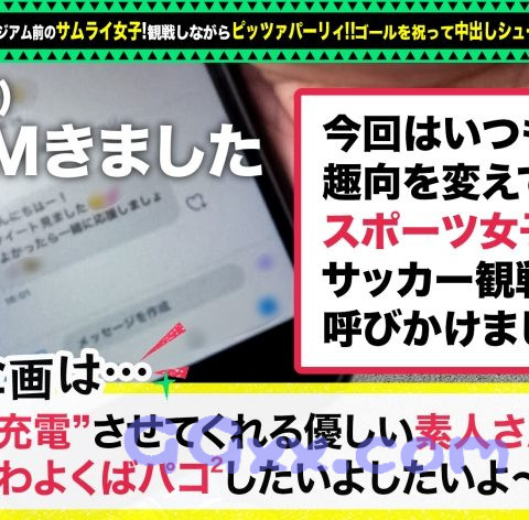 「充電させてくれませんか?」と優しい美女にお願いして、スマホを充電させてもらいつつエッチな充電もしちゃうスケベ企画。今回充電器を貸してくれた女神は、つばさちゃん!これからサッカー観戦をするようで、お友達と登場です♪観戦の出来る場所へ移動し、お酒やピザをツマミながら白熱観戦!見事日本がメダルを獲得し大盛りあがりwその場の勢いでトイレでヌいてもらっちゃいましたwそれだけでは足りないので、ホテルへGO!本番も楽しんじゃいます♪ユニフォームの下に隠れていたデカ乳を揉み、街で見せびらかしていたデカ尻をご開帳!めちゃエッチです!男は誰でも誘惑されてしまうであろうスケベボディですねwパイパンマ●コに電マを当てると、喘ぎ声が止まらない!手マンで追撃!特大の潮でソファをびしゃびしゃにしちゃいましたw今度はつばさちゃんからのサムライ濃厚フェラを受けちゃいます♪お尻をフリフリしながらグッポリ咥えて可愛いw竿から玉まで全部舐められちゃいました!ソファで挿入!激しく腰を振り、溜まりに溜まった精液を中にぶちまけてやりました!!!お風呂で精液を流しつつ、蛍光に光るローションでエッチにデコレーション♪つばさちゃんの身体が暗闇に光りめちゃエッチです!!チ●コも復活wお風呂から上がり、巫女コスプレで2回戦です!デカ尻を拝みながら背面騎乗位!からのおっぱいにローターを付けながら正常位!高速ピストンでラストは胸に濃厚射精!サッカーとセックス両方で盛り上がっちゃいましたwww