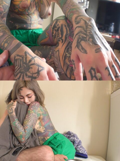 女性用風俗をやることが夢の全身TATOOの凛さんが服を脱いだ裸体を見たらむらむらして乳首や首筋を吸い、濃厚なDキスで舌をまぜあわせ、勃起したチ○ポを愛くるしそうに舐め、さらにクリをいじるとオマ○コの彫られているいる蝶々ビクビク動きながら、「アッあっ~~~えぇぇぇ~~」と感じ、シックスナインでしゃぶりまくり、舐めまくられた凛さんは「あ~うっうっうっ~~~」とマ○コにチ○ポをあてられ感じまくり、背面騎乗位やバックで「気持ちぃぃぃ、やばい、ヤバイ、あっあ~~~、いや~~~、奥、奥、いやー」と悶絶しお口の中に濃厚ザーメンを発射されました。複雑な半生をもつ凛さんはザーメン飲みたいや首●めFUCKが大好きなんだって