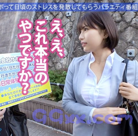 【テーマ】今日1日だけ会社を休んで、『行きたかった場所』に行く非日常体験をしてみませんか?あなたの行きたい場所への旅費は、全て番組が負担します!そして最後はしれっとセックスを目指す企画。今回は五反田駅周辺に出没!声をかけまくるが当然急に会社休める人なんておらず。唯一足を止めて話を聞いてくれたスーツ姿の女性。今まで会社をサボったことはないらしいが、説得してとりあえず上司に電話してもらったらすんなりお休みゲット!普段マジメに働いてるからこそですな!目的地を選んでもらいロケ車に乗り込んでレッツゴー!行先は千葉。道中では彼女の身の上話を。はずきさんは不動産会社で事務員として働く27歳。キレイで話しやすいが現在彼氏ナシ。なんと今の仕事の前には地下アイドルだったらしい。目的地に到着!まずはスーツにヒールでミカン狩り!他にも自然を生かしたアクティビティを楽しむ。夜はイルミネーションを眺め、そのあとはホテルで打ち上げ的な!で、お酒が入るとただでさえノリがいいのによりテンションが上がるはずきさん!キスしてもおっぱい揉んでも拒否ることはせず、そのままSEXに発展!遊んでる時からずっと気になっていたGカップおっぱいが露わに!手マンに電マで止まらない潮吹き!かなり盛り上がって中出しまで許してくれる始末!お風呂で汗を流した後にも彼女のテンションは治まらず2回戦!遊んでる時もSEXの時も笑顔が絶えない素敵女子!こんだけはしゃげば日頃の疲れはきっと吹っ飛んだはず♪