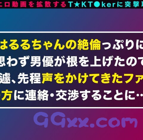 T☆kTokでエッチな動画を投稿するエロ可愛い女にDM(ダイレクトメッセージ)で連絡を取り、その場のノリでしれ~っとSEXまでしちゃおうという、次世代ナンパ企画!(1) 事前にスタッフが連絡を取り新宿区神宮前で待ち合わせた、今回のT☆kT●kerは「ハル」ちゃん(20歳)!普段は医療事務として働く彼女はT☆kTokでご自慢のマシュマロH乳を活かしたエロい動画を投稿している。 (2)待ち合わせた場所で彼女のHな生態を詳しく調べる!彼女がT☆kTokにエッチな動画を投稿している理由を聞いてみると、別にエロいと思って撮っているのではなく撮ったら自然にエロくなってしまったそうだ不思議!そんな彼女はオフパコは日常茶飯事昨日も五回戦もヤっちゃっというとんでもない絶倫ビッチだ!インタビューの途中奇跡的な出来事が起こるがそちらは本編でお楽しみください。彼女は今日もやる気満々!彼女のほうからお誘いが!早速ホテルへレッツゴー! (3) 到着するとすぐに服をはだけさせてこちらを誘惑!やったらとエロいカラダをこれでもかとまさぐり揉みこむ!パンツ越しにマ○コをふれるともうびしょびしょ!ノリノリエロモードからいやらしい笑みを浮かべてチンコを頬張る!凄まじいスゴテクに暴発寸前!チ○コをゴムを付けずにそのまま生挿入。正常位からバックへと激しく突かれ大絶頂!こちらも我慢ができず大量射精2連発!!快楽を貪る、とはまさにこのことお風呂移り三回戦突入!激しく乱れ合い鏡越しに強烈立バック!イキすぎぶっ飛び状態に!最後は3P乱交と怒涛の展開。2本のチ○コで突かれて揺れ光る爆乳!中出し連発の痙攣アクメ!男2人と濃密に愛し合う最高に淫らな女!圧巻の120分です!