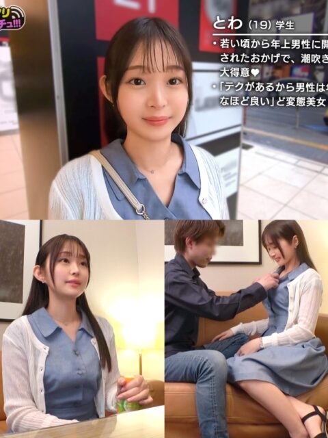 あらすじ:エッチ大好きなシロウト女子と遊んで、さらにエロい友達を紹介してもらうエロカワ女子数珠繋ぎ企画。今回の美女は義父とセックスしちゃってる19歳、とわさん。「潮吹きを開発されてて…」と宣言通りに潮吹きまくりの敏感娘!問答無用でマ●コをおもちゃ責め&口では激しくジュポジュポフェラ!上下の穴を同時に責めちゃいます♪…