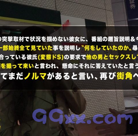 ○テーマ:夜の巷に出没するルックス&内面&etcがぶっ飛んだ素人女性の性態にグイグイ首を突っ込むドキュメンタリー①今回は池袋で激レアさんを探します。誰かいないかと街中をウロウロしてたら駅近くでなんだか挙動不審な美人を発見!遠目から様子を確認していると、男性に声を掛けてコートの中をチラチラ見せている彼女。何かを交渉したのかそのままホテルに入っていきました。②ホテルから出てくるのを待って彼女が一人になったところで声を掛けて撮影交渉してみると快く引き受けてくれました。遠目から撮影していると又新しく男性の逆ナンに成功したようでホテルに入っていきました。終わったところで改めてお話を聞いてみます。③付き合ってる男性の命令で知らない男性に声を掛けてセックスしている様を動画に撮っているらしく撮りたてホヤホヤの動画を見せて貰うと布面積がほぼないセクシーな衣装に身を包み、積極的に男性を攻めている姿が…!④AV男優に抱かれてみないかと提案すると戸惑いつつも興味はあるようでOKを頂きました!早速ホテルに移動してコートを脱いで貰うと先程動画で見せて貰ったセクシーな衣装がお目見え!ち○ぽを差し出せば長い舌を使ってうっとりとした顔で懸命に舐めて味わっています。⑤男優が到着してセックスが始まれば、目をとろんとさせて答えれくれます。手マンでイかされた後に挿入してゆっくり突き上げると、涙を流しながら「気持ち良い」と喘ぐ彼女。男優2人に何度も交互に挿入され足腰が震える程イきまくっていました。