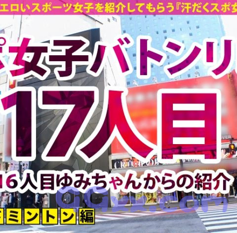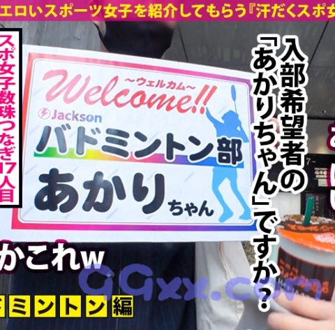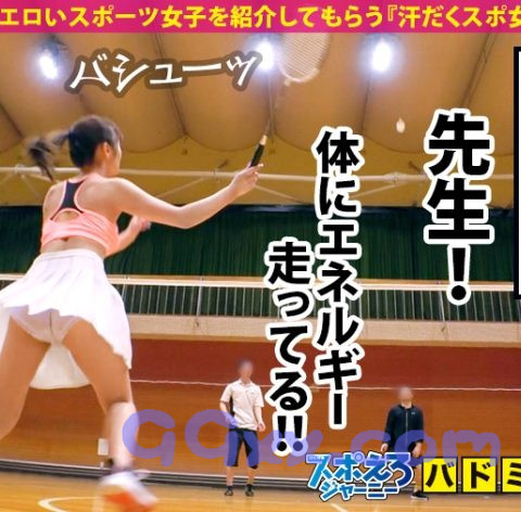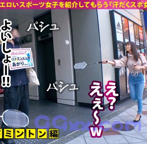 可愛くてエロいスポーツ女子を紹介してもらう『汗だくスポ女子』企画!①今回は、渋谷でスポ女子と待ち合わせ!登場したのはスレンダーで爽やかな女の子、『あかりちゃん』です!バドミントン経験年数はトータル6年くらいのあかりちゃん。今日は約10年ぶりのバドミントンだそうでちょっと緊張しているご様子。②近くの体育館へと移動してコスチュームに着替えていただきます。バッドなしのノーブラスポコスで乳首やおっぱいのサイズが丸わかり!そんな格好を恥ずかしがりながらも早速ラリー開始。久しぶりのバドミントンで、あまり上手いことできない様子ですが、そんなことスタッフはお構いなし!動くたびに揺れるおっぱいや、スカートの裾から覗くパンツに釘付け!トップスをまくりあげおっぱいを露出させたり、ローターを仕込んだりとエッチなイタズラを仕掛けます!③ホテルへと移動し、男優とご対面!濃厚なキスを交わしてプレイスタート!サービス精神旺盛なあかりちゃんは、男優の巨根を丁寧に舐め上げご奉仕!お礼におま○こをクンニや手マンで責めてあげると、いやらしい声を上げてよがり、電マを当てられながらの手マンで絶頂してしまいます!!ズボッとバックで巨根を挿入!激しく膣奥を突かれると絶叫のような喘ぎ声を上げ、悶絶しまくり♪プリッとした形のいいお尻に発射して一回戦終了。④フィニッシュから間髪入れずに二回戦開始!スポーツコスチュームに着替えてますますヒートアップする二人!潮吹き、オイルプレイ、中出しなどなど大興奮必至のプレイが盛り沢山!!激しく濃厚なスポコス女子のセックスはぜひ本編でお楽しみください!