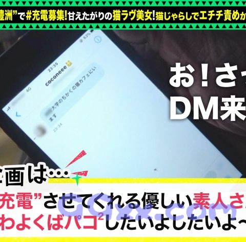 「充電させてくれませんか?」と優しい美女にお願いして、スマホを充電させてもらいつつエッチな充電もしちゃうスケベ企画。今回充電器を貸してくれた女神は、ここねちゃん!猫が大好きな大学生さんです!猫トークで大盛りあがりし、猫カフェでグッズを沢山買っちゃいました♪移動中の車内で「甘えたいときもあります」とこぼしていたので、それならばと!ホテルへGO!存分に甘えてもらいましょう!wまずは購入した猫グッズで全身愛撫!大人の玩具も混ぜつつ、気持ちよくしちゃいます!そして手マンでグリグリ責めていると、自分からチ●コをペロペロするようになりましたwここねちゃんにマンぐり返しならぬチンぐり返しをされスケベフェラ開始!めちゃめちゃ吸い上げられてすぐイキそうwお返しにシックスナインで対抗です。ここねちゃんから切ない声が漏れ始めたので挿入しちゃいます!キツマンが絡みついて最高!!もはや喘ぎ声ではなく叫ぶここねちゃんw本当に気持ちよさそうにセックスしてくれます♪充電のお礼に中出しをプレゼント!まだまだヤリ足りないのでお風呂で二回戦です!お尻をローションでヌルヌルにして挿入!バックからガンガン突きます!ベッドへ移ってもバックを責め続け、正常位でラストスパート!顔射でフィニッシュ!!この後お掃除フェラをたっぷりと奉仕してくれて、思わず三発目が出ちゃいそうになりましたw