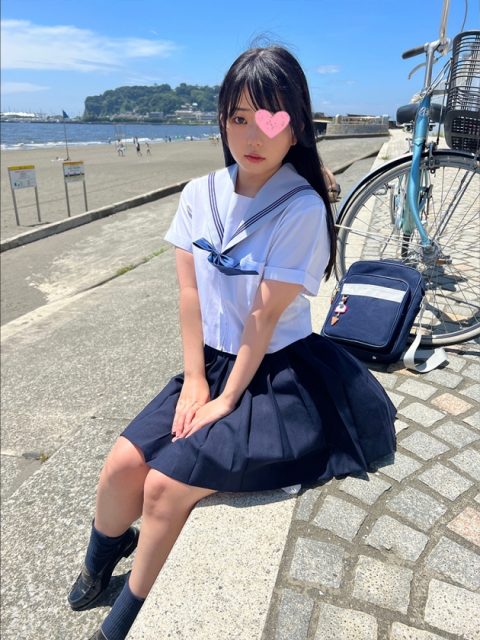個人撮影になります。今回は神奈川県湘南の女子K②とP活をしてきました。その時の様子を無断で配信しています。所持に関して責任を負えませんので、あらかじめご了承ください。丁度下校中だったらしくセーラー服でチャリを押しながら現れました。通学路だったんで、同級生に怪しおじさんと一緒にいる所を目撃されないか不安がっていましたね。顔を撮られるのも抵抗があったようですが、何とか言いくるめて撮影させてもらえました。ホテルに向かう前に海辺を軽く散歩。入室してからセーラー服をまじまじと観察室内では照れ隠しではしゃいでいるようでした。マスクを外してフェラ、マスクの下は予想以上の可愛い感じのお顔でした。前戯の際はずっと恥ずかしがっていました。照れている感じが可愛かったんで、制服をはだけさせて記念撮影までしちゃいました。下着は可愛らしい薄ピンク色でした。恥じらってパンツを見せつけている姿に興奮しちゃったんで、目の前でオナニーを披露してあげました。案の定、可愛いリアクションが見れて満足です。下着にち○ぽを擦り付けたり、おフェラしてもらったりしてと遊んできちゃいました。せっかくの貴重なセーラー服女子なので、着衣のままハメてきちゃいました。最初は騎乗位で彼女に動いてもらい、正常位でうっかり中出ししちゃいました。勝手に中に出して怒られちゃいましたが、後日、病院に付き添いで行く事になっちゃいました。シャワー後、帰ろうとしていたんでまだ20分ぐらい時間余っていたんでちょっと呼び止めて、今度は裸を撮らせてもらいました。時間置いたら復活してきたんで、もう一発SEXしてきちゃいました。2回も中出ししてきたんで、このまま妊娠していると良いですね。