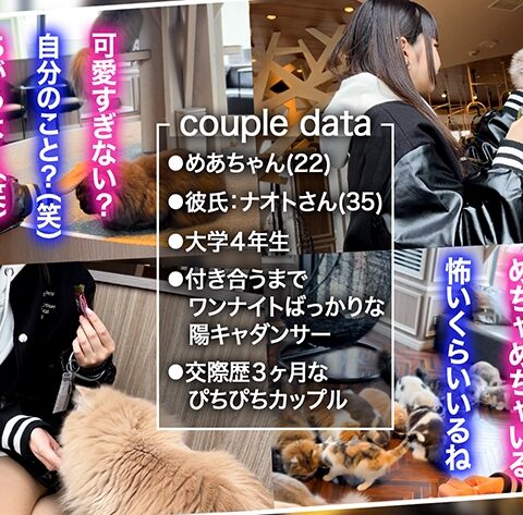 カップルの数だけセックスの形がある!心も身体も許しあった2人による素のイチャラブハメ撮りを大公開する企画♪今回はセクシーダンサーとして急成長中の女子大生「めあ」。猫カフェデートで癒やしの一時♪デートの最後はホテルへ行き踊るような熱烈SEXに没頭!!洗練されたストイックBODYがチ●コを貪りエンドレスTwerk(トゥワーク)!射精止まらず連続中出しッ!◇猫とふれあう関西弁の陽キャ彼女◇エロ過ぎて出禁確定の尻振りダンス◇踊るような腰使いのグラインド騎乗位◇「またイっちゃうよっ…!イっていいっ!?」「おかしくなっちゃう~~~!」【キミ恋】B:83 W:56 H:83