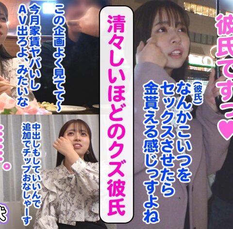 あらすじ:様々な理由からお金に困っているZ世代女子にお金を渡す条件でエッチなことをしてしまおうという企画!働きたくない!楽して稼ぎたい!責任を負いたくない!自由でいたい!etc.ヤれば楽して稼げると世の中を舐め切ったビッチな彼女たちに大人の厳しさを身体で教えちゃいます!!今回は21歳ケーキ屋店員のあおいちゃん。クズ彼氏のために稼いだお金を貢ぐ日々…最近は「そのエロい身体使って金稼いでこい!」と命令されパパ活・円光をさせられている。はちきれんばかりの爆乳と色白むっちりボディ!Z世代癒し系女子が恋人の前で泣きじゃくり性交!!
