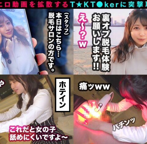 あらすじ:T☆kTokでエッチな動画を投稿するエロ可愛い女にDM(ダイレクトメッセージ)で連絡を取り、その場のノリでしれ~っとSEXまでしちゃおうという、次世代ナンパ企画!!今回のT☆kT●kerはボンッ!キュ!ボン!の巨乳むち尻BODYを武器に、卑猥な営業をかけまくって、お客をゲットするRioちゃん(20歳)_再来年まで予約でいっぱいという大人気な彼女!そんな彼女の脱毛エステを今回特別に無料体験していただける事に!早速ホテルの浴室を使ってチ●毛を脱毛体験!場所が場所なので彼女の柔らかい指が何度もチ●ポに当たった結果→たちまち勃起してしまい…しかし彼女もまんざらでもない様子、いやらしい手つきと舌技でおチ●ポエステはじめちゃいました♪…その後はエロくて生々しいセックスをたっぷり堪能!オール中出し3連発!