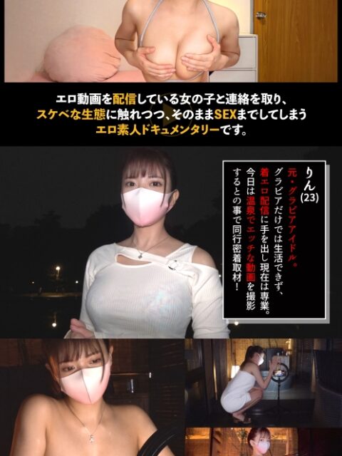 あらすじ:エロ動画を配信している女の子と連絡を取り、その動画やその生態に触れつつ、そのままSEXまでしてしまうエロ素人ドキュメンタリーです。待ち合わせをしていたrinさんとエロ動画撮影!露天風呂で普段の撮影を終えたら、お風呂でそのままチ●コ追加!?フェラで一発抜いてもらい、部屋に移動して続きを致しちゃいます♪…