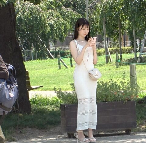 白のノースリーブワンピに負けないくらいの透き通るような白肌が眩しいモデル体型の女子大生。