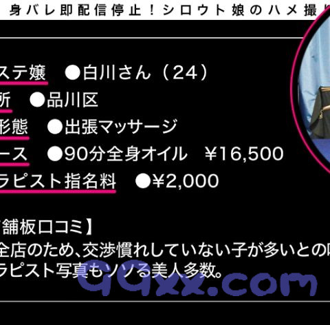 【身バレ即配信停止】―――――《この作品はエステが好き過ぎてエステ嬢と結婚するも、エステ狂いが原因で離婚した盗撮好き汁男優のエステ盗撮ドキュメントである。》―――――※本作品は4K高画質で録画されております。そのため一般的な盗撮作品よりも高画質での収録となっておりますが、お客さまの再生環境により、画質は異なります。ご了承下さいませ。―――――【今回のメンエス嬢】・白川さん 24歳 →ハメ撮り&中出しOK!顔も○ ・本番交渉難易度:ノリ良し○・感度:バッチリ○ →ハメ潮スプラッシュ!【料金】品川区発・某出張マッサージ店(健全店)・90分全身オイルマッサージ →¥16.500 ・セラピスト指名料 →¥2.000―――――#白川さん #24歳 #出張マッサージ嬢#中出し! #イキまくり #ド敏感 #スプラッシュ潮吹き #逆マッサージ #電マ責め絶頂 #盗撮 #ハメ撮り #6カメ #90分オイルマッサージコース#品川区発某店 #健全店 #本番―――――素人ハメ撮りクルー『だまちゃん。』による超グレーな完全個人撮影モノ!!!※無許可素人作品につき取り下げ可能性がある作品になります。