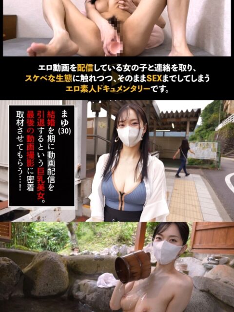 あらすじ:エロ動画を配信している女の子と連絡を取り、その動画やその生態に触れつつ、そのままSEXまでしてしまうエロ素人ドキュメンタリーです。今回はmayuさんが登場!婚約中なのでエロ動画投稿は今回で引退みたいです。それならば思いっきりハメまくりましょう♪と挑んだものの、温泉ではmayuさんの魅惑のボディ+テクで一発KO!もちろんこんなあっさり抜かれたままでは終われません!!浴衣に着替えた後はこちらのターン!ヤリ返しちゃいます♪たっぷり蓄えたマン毛がセクシー!敏感過ぎてちょっと手マンしただけで腰ガクガクw…